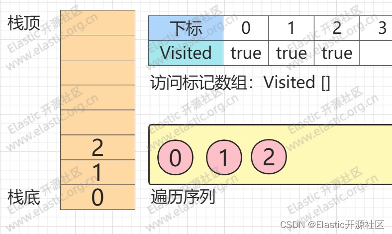 **此时,`节点0`的所有出度邻接点均已访问,`节点0`出栈,此时为空栈